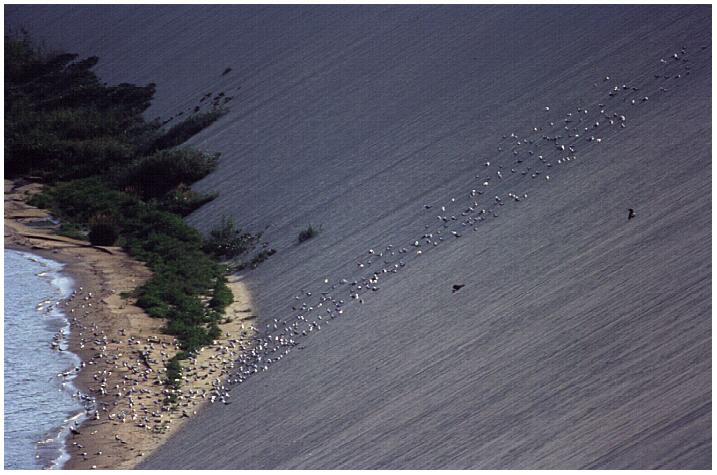 Nicht weit entfernt von Nidden liegt eine der letzten großen Wanderdünen, die "Hohe Düne". Auf ihrem mächtigen Rücken verläuft die Grenze zum russischen Teil der Nehrung. Litauische Grenzsoldaten machen dort ein Weiterkommen unmöglich. Die Optimalform einer Wanderdüne ist die Parabel. Ihre offene Seite ist dem Haff zugerichtet, da die Nehrungswinde vorwiegend von der Ostsee kommen. Die Parabelform entsteht durch den Umstand, daß der Wind auf dem mächtigen Dünenrücken größere Sandmengen zu transportieren hat, als auf den kleineren Flanken. Diese eilen hierdurch dem Mittelteil der Düne voraus und es entsteht eine Parabel. Da sich einzelne Dünen zum Teil überlagern und die Windrichtung wechselt, ist eine optimale Parabelform jedoch selten. Die Form der Hohen Düne bei Nidden zeigt diese Phänomen jedoch deutlich. Der Luvhang (Ostseeseite) der Wanderdünen steigt mit vier bis zwölf Grad flach an. Da die Windgeschwindigkeit mit steigender Höhe zunimmt, geht ihre maximale Höhe über sechzig Meter nicht wesentlich hinaus. Der vom Wind über die Oberfläche des Luvhangs getriebene Sand, kommt im Windschatten des Leehangs wieder zur Ruhe. Es ensteht haffseitig ein Sturzhang mit einer Steigung von rund dreißig Grad. Während der Luvhang langsam abgetragen wird, schiebt sich der Leehang stetig nach vorne, die Düne wandert. An stürmischen Tagen ist die Sandfracht des Windes so groß, daß der Kamm der Düne zu rauchen scheint. Der Sand des Luvhangs besitzt aufgrund des auf ihm lastenden Winddrucks eine gewisse Festigkeit. Der Leehang befindet sich dagegen im Windschatten, sein Sand liegt daher sehr locker. Er kommt sehr leicht ins Rutschen, wodurch sich eigentümliche Sandnasen und Streifen bilden. Sind dies die Kennzeichen des Leehangs, so sind es am Luvhang die Wellenfurchen. Die Wellenlinien des Sandes entstehen auf die gleiche Weise, wie diejenigen auf Wasserflächen. An der Grenzfläche zweier Medien, die sich unterschiedlich schnell bewegen, entstehen sogenannte Helmholtzsche Wellen. Das enorme Gewicht der großen Dünen drückt oft den weichen Haffmergelgrund (Ton-Kalk-Gemisch) nach oben. Eine solche Haffmergelaufpressung befindet sich auch am Sturzhang der Hohen Düne in Nidden. Der fruchtbare Haffmergel ist dort dicht mit Vegetation bedeckt. Der Sand unter der Oberfläche der großen Dünen ist recht feucht. 1922 ereignete sich bei Schwarzort ein sogenannter Dünensturz. Vorausgegangene starke Trockenheit und ein abfallender Grundwasserspiegel führten zu einer Austrocknung einer dortigen Wanderdüne. Mit einem Grollen in ihrem Inneren wurde ein Aufreißen und Zerfallen der Düne eingeleitet, bei dem große Sandmassen ins Haff stürzten. Vogelzuggebiet