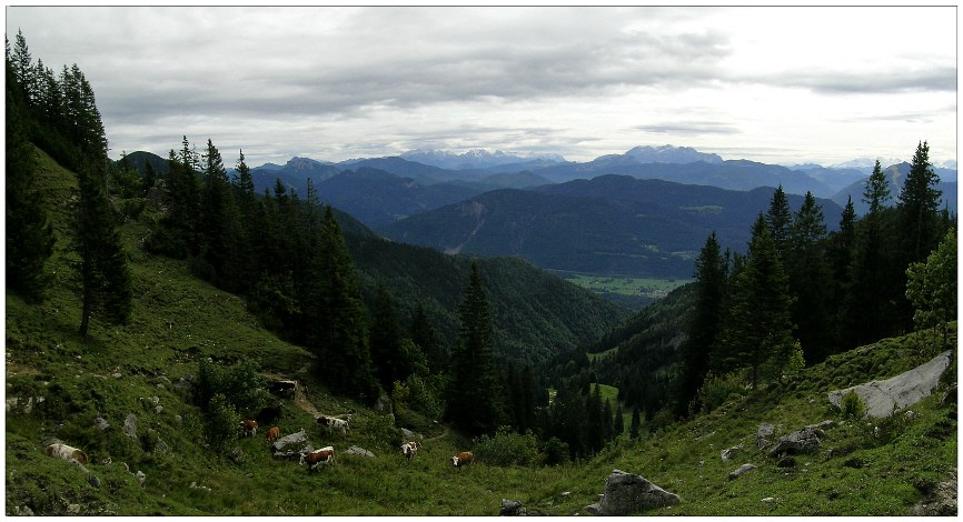 Blick vom Sattel des Panoramawegs nach Südosten auf Berchtesgadener Alpen und Loferer Steinberge