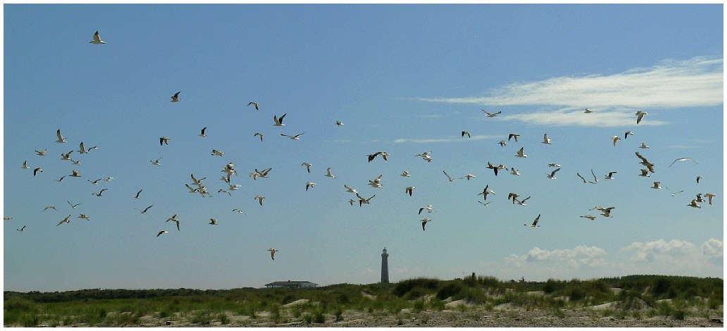 Möwenschwarm mit Leuchtturm von Skagen im Hintergrund (