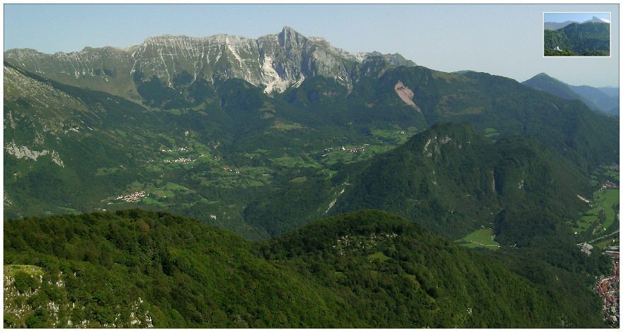 Aus der Bergkette hinter dem Stol ragt der Krn (2244m) markant hervor