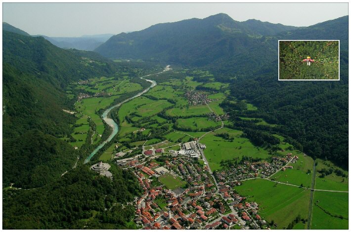 Kirche St. Anton, Kobarid und die Soca aus der Luftperspektive