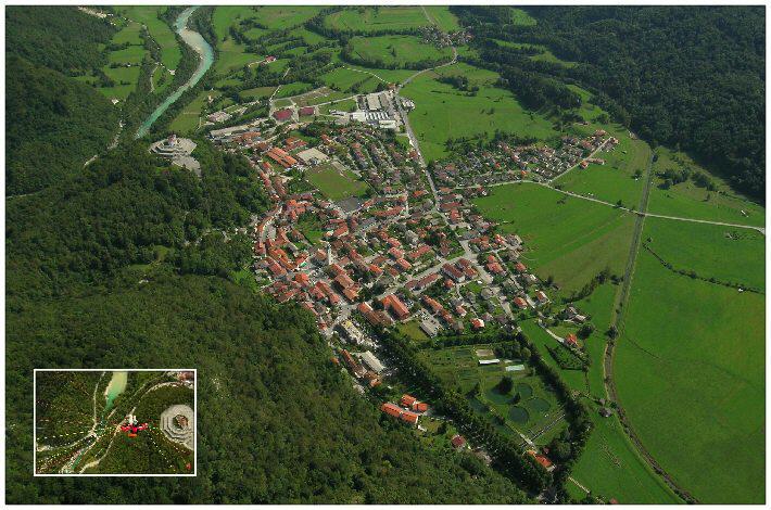 Kobarid mit dem Landeplatz auf der rechten, oberen Bildseite (