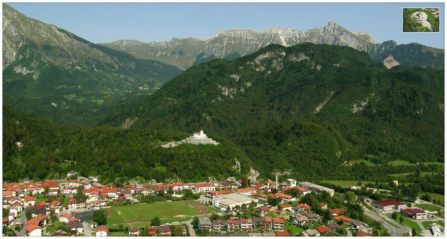 Blick auf Kobarid und Kirche St. Anton kurz vor der Landung