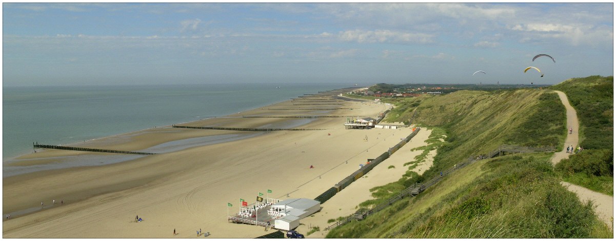 Strand-Panorama mit Strandpavillons und fliegenden Gleitschirmen in Zoutelande bei Ebbe
